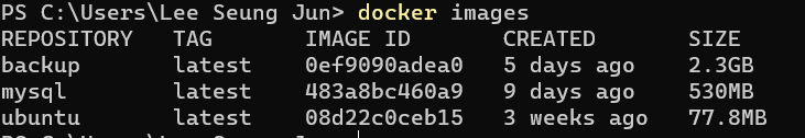 잘 받아졌는지 확인하려면 다음과 같은 명령어를 입력하면 가지고 있는 이미지 리스트를 보여준다.