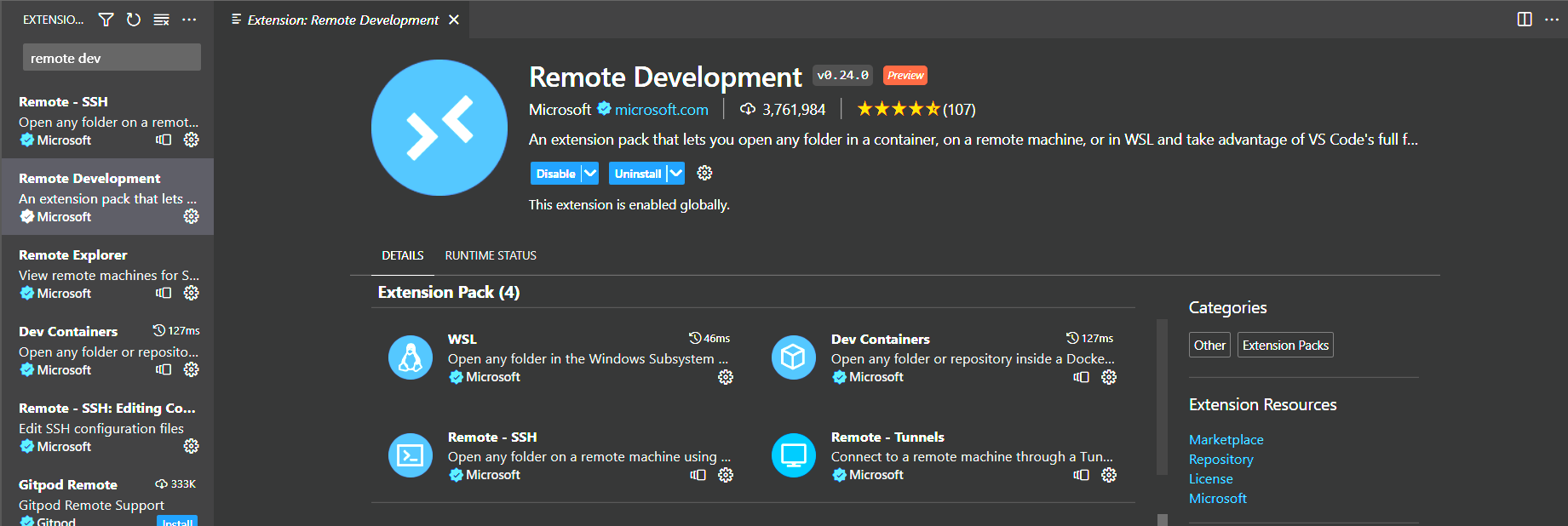 vs code의 플러그 인 탭으로 가서 마이크로소프트에서 배포한 Remote Development를 설치한다.