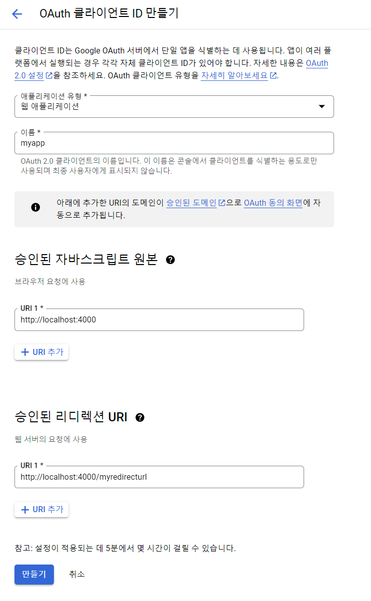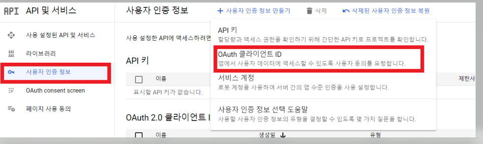 2. 사용자 인증 정보 탭에서 `사용자 인증 정보 만들기 > oauth 클라이언트 ID`를 클릭한다.