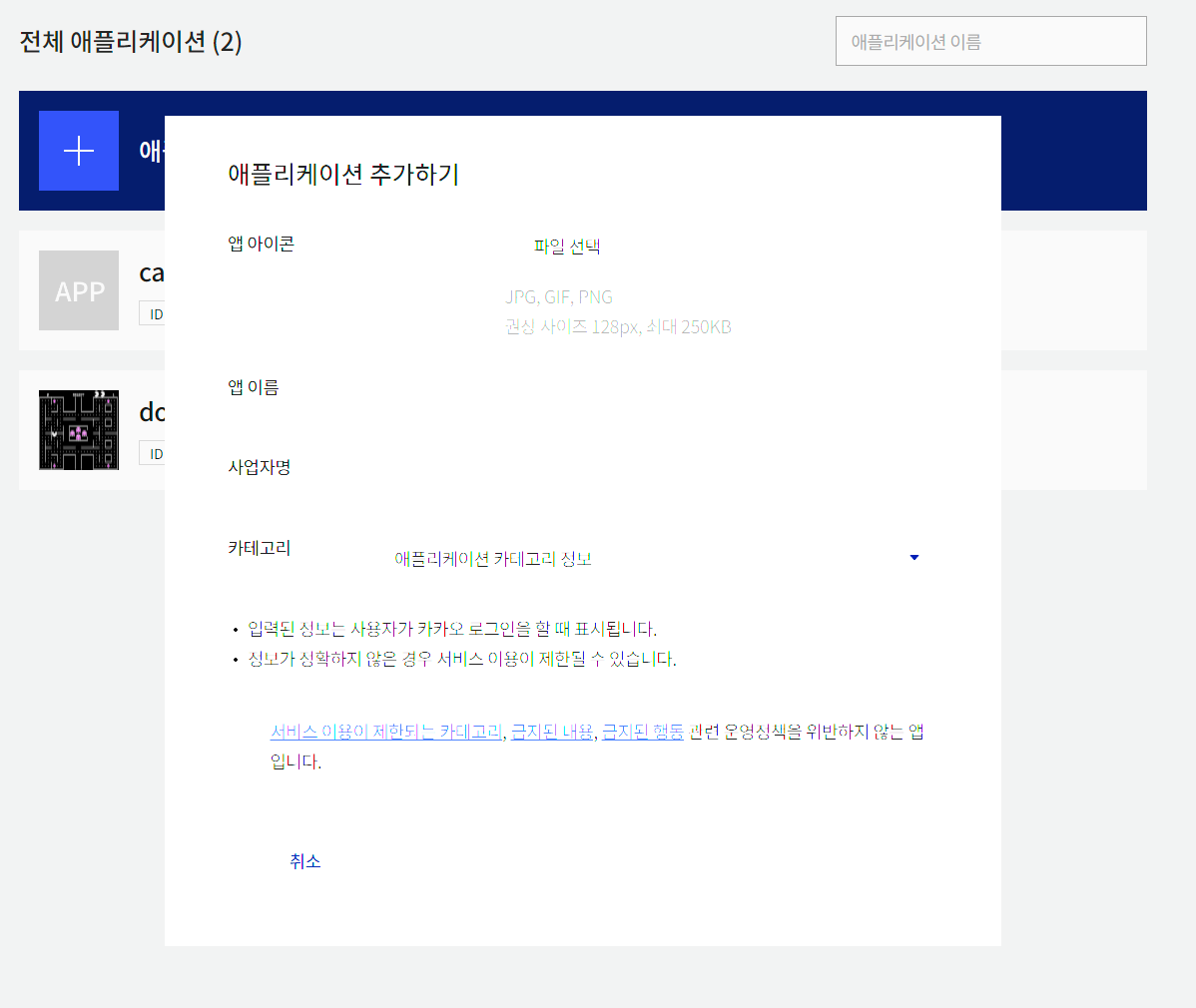 2. 어플리케이션 추가하기를 클릭하고 항목들을 채워준 후 저장한다.