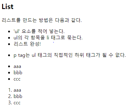 리스트의 항목들을 구분하기 위해 각 요소에 <li> 태그를 붙여준다. 이렇게 하면 앞에 말머리가 붙어서 출력된다.