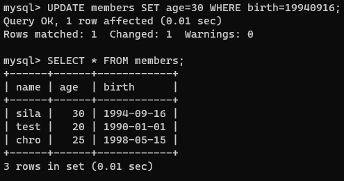 UPDATE members SET age=30 WHERE birth=19940916;
