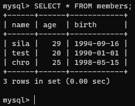 INSERT INTO members(name, age, birth) values(test, 20, 19900101);