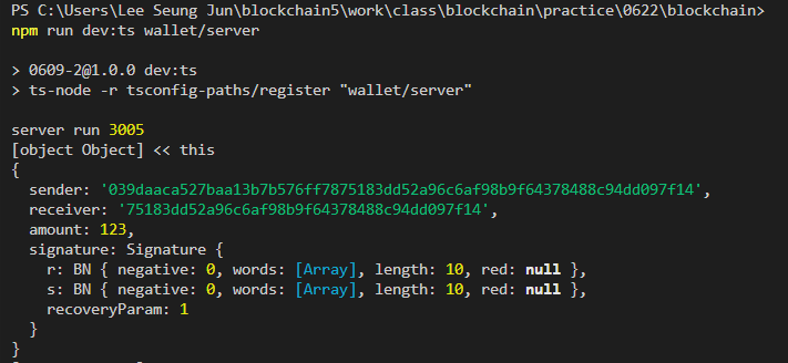 이를 위해서는 블록체인 서버 쪽에서도 지갑 class 객체를 생성해줄 필요가 있다.