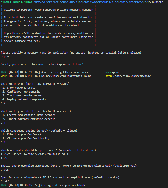 puppeth을 입력해 네트워크 초기값을 설정한다.