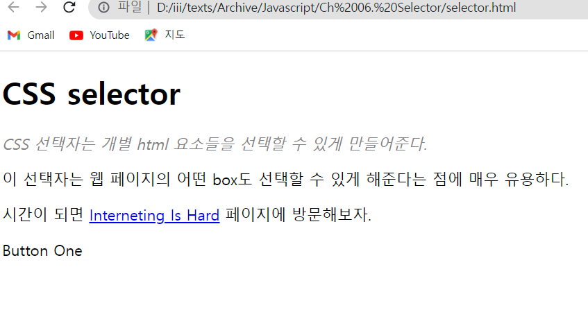 CSS로 스타일링을 진행할 때, 일괄적으로 모든 요소들을 동일하게 스타일링하는 경우보다 우리가 원하는 특정 요소만 선택해서 그 요소만을 스타일링 하고 싶은 경우가 많을 것이다. 이 때, css에게 어떤 요소를 스타일링하고 싶은지 구체적으로 특정해주고 싶을 때 사용하는 것이 바로 선택자(selector)이다. 이 장에서는 class 선택자, ID 선택자, 유사 class 등 특정 요소를 선택해 스타일링하는 방법을 알아볼 것이다. 5.1 Set up 다음과 같이 html, css를 생성해주자. CSS selector CSS 선택자는 개별 html 요소들을 선택할 수 있게 만들어준다. 이 선택자는 웹 페이지의 어떤 box도 선택할 수 있게 해준다는 점에 매우 유용하다. 시간이 되면 Interneting Is ..